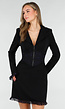 Deze zwarte blazerjurk met schoudervullingen heeft een aangesloten bovenkant met een diepe V-halslijn en een korsetlook mesh inzetstuk voorzien van kunststof baleinen. Het inzetstuk is afgewerkt met een middenrits en blauwe glitteraccenten. De jurk heeft lange mouwen met mesh ruffle afwerking aan de manchetten en een rechte rok met dezelfde mesh ruffle aan de onderzijde. Het materiaal voelt stevig aan en heeft stretch.