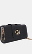 Deze clutch in het zwart is uitgevoerd in gevlochten imitatieleer en afgewerkt met een goudkleurige ketting. De tas heeft een rechthoekige vorm met beige interieur en biedt voldoende ruimte voor je telefoon en kleine essentials. Aan de voorzijde is een flapdetail zichtbaar, voorzien van een goudkleurig accent, wat de clutch een luxe uitstraling geeft. Dankzij de afneembare schouderketting kan de tas zowel handmatig als crossbody gedragen worden.