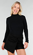 Deze zwarte top heeft een aangesloten pasvorm en een hoge col. De lange mouwen sluiten nauw aan. De stof is glad en licht rekbaar en vormt zich naar het lichaam. De zoom valt op heuplengte en heeft een rechte afwerking.