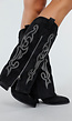 Deze zwarte cowboylaarzen zijn uitgevoerd in een zachte suèdelook en hebben een hoge schacht met zilverkleurig borduurwerk in een golvend patroon. De bovenrand loopt in een uitgesneden V-vorm en is voorzien van lussen aan beide zijden. Langs de buitenzijde loopt een zilverkleurige rits. De laars heeft een spitse neus met geborduurd detail op de wreef.