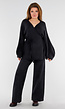 Deze zwarte set bestaat uit een lange mouw overslag top en een bijpassende lange broek. De top heeft een diepe V-hals en sluit met een smal strikceintuur in de taille. De mouwen zijn wijd en vallen tot aan de pols. De broek heeft rechte, wijde pijpen. Het materiaal heeft een fijngebreide structuur met stretch.