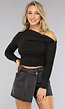 Deze stretch top is gemaakt van een hele elastische zachte stof. De top is voorzien van lange mouwen welke aan de ene kant net over de schouder valt. De hals van de top valt gedrapeerd en in de zij zit een leuk geplooid detail.