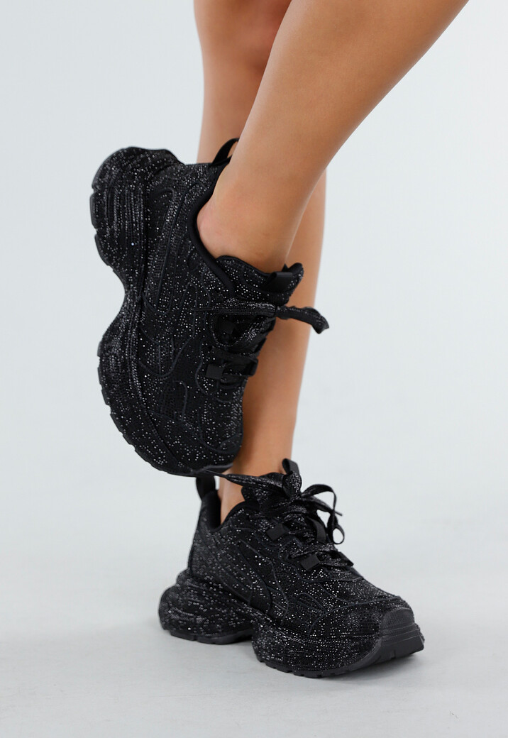 Deze sneakers zijn volledig uitgevoerd in zwarte strass steentjes en hebben een sportieve, robuuste uitstraling. De schoenen zijn voorzien van een dikke, lichtgewicht zool met grof profiel. De veters en zool zijn zwart en de hiel is uitgerust met een aantreklus. De binnenzijde is gevoerd en de zool is afgerond en stevig.
