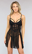 Deze babydoll is gemaakt van een zachte mesh doorschijnende stof welke is afgewerkt met mooie kanten details. Hij heeft een triangel model en is voorzien van verstelbare spaghettibandjes. Aan de onderkant is de jurk mooi geplooid en valt wijder uit.