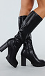 Deze zwarte laarzen reiken tot net onder de knie en zijn uitgevoerd in een glad materiaal met lichte glans. De schacht sluit nauw aan en heeft een ton-sur-ton ritssluiting aan de binnenzijde. De laars heeft een stevige blokhak met grof profiel in de zool. Het bovenwerk is glad afgewerkt met minimalistische stiksels en een ronde neus. Het geheel is monochroom zwart, inclusief de zool, hak en rits.