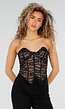 Deze zwarte bustier top is uitgevoerd in kant en heeft een strapless model. De top heeft voorgevormde cups en verticale baleinen die zorgen voor extra vorm en ondersteuning. De onderkant loopt puntvormig naar beneden voor een corset look. Dankzij de stretch in de stof sluit de top mooi aan op het lichaam.