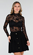 Deze body is uitgevoerd in zwart transparant kant met een bloemendessin en heeft een aangesloten pasvorm. Het model is voorzien van lange mouwen en een hoge halslijn met een verfijnde kanten afwerking. Aan de voorzijde loopt het kant in een V-vorm over de borst. De body sluit aan de onderkant met drukknoopjes, waardoor deze praktisch aan en uit te trekken is. Het materiaal is licht elastisch en sluit nauw aan op het lichaam.