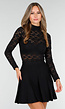 Deze zwarte top is uitgevoerd in een rekbare kantstof met een bloemachtig patroon. De stof is transparant. Het model heeft lange mouwen en een smalle colkraag. De top valt recht langs het lichaam en heeft een licht aansluitende pasvorm.
