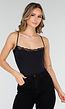Deze body is uitgevoerd in een effen zwarte kleur en heeft een aansluitende pasvorm. Het model is uitgevoerd als string body en is voorzien van smalle, verstelbare spaghettibandjes. Langs de halslijn en de beenopeningen is kant verwerkt met een fijn bloemendessin. De body is hoog uitgesneden bij de benen, wat zorgt voor een duidelijk gevormde belijning aan de voor- en achterzijde. De stof bevat stretch, waardoor het model strak aansluit op het lichaam. De body sluit aan de onderzijde met druk knoopjes, wat zorgt voor een praktische sluiting. Deze string body kan als top gedragen worden, maar is ook geschikt om onder kleding te dragen als hemdje.