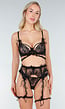 Deze lingerie set is uitgevoerd in zwart kant met een transparante structuur en een fijn bloemmotief. De set bestaat uit een beugel-bh, een slip, een jarretelgordel. De bh is voorzien van beugels voor ondersteuning en heeft verstelbare schouderbandjes met kleine strikdetails. De slip heeft een aansluitende pasvorm en is volledig uitgevoerd in kant. De jarretelgordel wordt los gedragen over de slip en is voorzien van jarretelbanden. Alle onderdelen zijn gemaakt van elastisch kant.