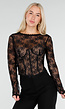 Deze zwarte top is uitgevoerd in transparante kant met stretch. Het model heeft lange mouwen, een ronde halslijn en een aansluitende pasvorm. De voorzijde is afgewerkt met zichtbare naden en een ingewerkte beugel voor een corsetlook. Onder de kanten top zit een beige korsetvoering die zorgt voor extra ondersteuning en een subtiel contrast onder de transparante stof. De top sluit aan de achterzijde met een knoopsluiting in de nek.