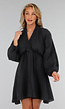 Deze zwarte korte jurk is gemaakt van een luchtige, gestructureerde stof zonder stretch met een lichte kreuktextuur en linnenlook. De jurk heeft een V-hals met verticale ruches langs de halslijn en een geplooide naad onder de buste. De lange mouwen zijn losvallend en eindigen in elastische manchetten. De rok heeft een subtiele A-lijn en valt boven de knie. Aan de achterzijde is een elastische tailleband verwerkt voor een aansluitende pasvorm, deze valt in een V-vorm om jouw figuur extra goed uit te laten komen!
