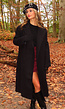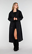 Deze zwarte jas is gemaakt van een stevige stof met een gladde afwerking. De jas heeft lange mouwen en een rechtvallende pasvorm die tot op de enkels reikt. Aan de voorzijde sluit de jas met een dubbele rij knopen en aan de achterkant bevindt zich een split voor extra bewegingsvrijheid. Verder is de jas voorzien van steekzakken aan beide zijden en knoopdetails aan de mouwuiteinden.