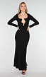 Deze zwarte maxi jurk is gemaakt van stretch en heeft een nauwsluitende pasvorm. De jurk heeft een diepe halsuitsnijding met golvende rand en metalen accenten, wat zorgt voor een opvallend detail. De lange mouwen en gladde stof geven de jurk een elegante uitstraling.
