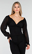 Deze zwarte top is uitgevoerd met een vaste korsetstructuur en doorzichtige mesh mouwen. De halslijn is voorzien van een striksluiting, die het model extra detail en vorm geeft. De mouwen zijn licht gepoft en afgewerkt met elastische manchetten. Het lijfje heeft een verstevigde pasvorm die mooi aansluit op het lichaam en zorgt voor een elegante, gedefinieerde uitstraling.