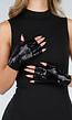 Deze zwarte handschoenen zijn gemaakt van soepel stretchmateriaal met een metallic glans. Ze hebben een kort model met halve vingers, waardoor je vingertoppen vrij blijven. De stof sluit strak aan en rekt licht mee, wat zorgt voor een comfortabele pasvorm. Ideaal voor feestjes, dansavonden of thema-outfits.