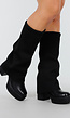 Deze zwarte plateau laarzen hebben een ribgebreide schacht die losjes om het been valt. De laarzen zijn uitgevoerd met een stevige plateauzool en een brede blokhak. Onder de stoflaag zit een rits verwerkt, zodat je de laarzen makkelijk aan- en uittrekt.