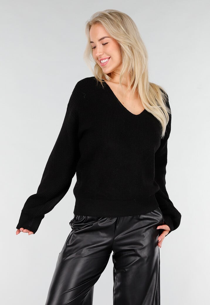 Deze zwarte gebreide trui heeft een diepe V-halslijn en een zachte, soepel vallende pasvorm. De trui is gemaakt van een fijn gebreide stof met een subtiele ribstructuur en lange mouwen met lichte elasticiteit aan de manchetten. De comfortabele stof voelt zacht aan op de huid en zorgt voor een elegante maar ontspannen uitstraling. Ideaal te combineren met een jeans of rok voor een casual chique look.
