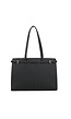 Deze zwarte shopper is uitgevoerd in een gestructureerd materiaal met leerlook en heeft een ruim rechthoekig ontwerp. De tas beschikt over twee lange schouderhengsels waardoor ze comfortabel over de schouder te dragen is. Aan de bovenzijde is de tas voorzien van een smalle band met goudkleurige gespsluitingen als detail, terwijl de achterkant een ritsvak heeft voor extra opbergruimte. De bodem is verstevigd en afgewerkt met vier goudkleurige beschermknoppen. Met de nette verticale stiksels en strakke lijnen is dit een praktische tas met een verzorgde uitstraling.