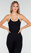 Deze zwarte sport top is uitgevoerd in een zachte stretchstof die soepel meebeweegt tijdens het sporten. De top heeft smalle spaghetti bandjes en is afgewerkt met witte randen langs de halslijn en schouderbandjes. De ingebouwde pads zorgen voor ondersteuning en vorm. Het model heeft een aangesloten pasvorm en een rechte onderzoom die aansluit op de heup.