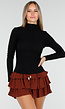 Deze zwarte stretch top is uitgevoerd in een aansluitende pasvorm met een subtiele textuur in de stof. Het model heeft een col en lange mouwen, wat zorgt voor een strakke en nette uitstraling. De stof is licht en soepel, waardoor de top fijn aansluit op het lichaam. De col heeft een lichte opstaande vorm en sluit mooi aan bij de hals.