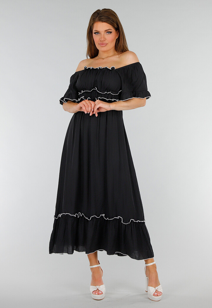 Deze zwarte maxi jurk is voorzien van een luchtige, fijn geweven stof. Het elastische schoudergedeelte biedt de mogelijkheid om de jurk off-shoulder te dragen. De bovenkant heeft een prachtig gerimpeld detail en een elastische tailleband die je figuur mooi accentueert. Aan de achterkant bevindt zich een blinde ritssluiting voor een strakke afwerking. De rok valt wijd uit en eindigt bijna tot aan de enkels, met een ruffle aan de onderkant. Perfect voor een avondje uit of een zomerse stranddag.