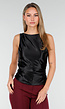 Deze zwarte satijnlook top heeft een zachte glans en een luxe, elegante uitstraling. De hoge halslijn zorgt voor een chique effect, terwijl de open rug met brede strik een vrouwelijke look geeft. De top is voorzien van pads, waardoor een bh niet meer nodig is. Het mouwloze ontwerp maakt deze top ideaal voor feestelijke gelegenheden, avondlooks en nette events.