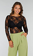 Zwarte Kanten See Trough Top van Stretchmateriaal met Lange Mouwen en Ingewerkt Bloemenmotief
