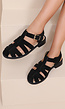Zwarte sandalen met een open neus en meerdere banden over de voet. Voorzien van een verstelbare gesp aan de zijkant en een platte zool.