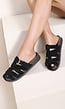 Zwarte slippers met meerdere brede bandjes over de voet. Voorzien van verstelbare gespen voor een aanpasbare pasvorm. De slippers hebben een platte zool en een open teen.