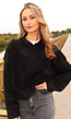 Dit zwarte jasje is uitgevoerd in een zachte suèdelook stof. Het model heeft een rechte, losvallende pasvorm met verlaagde schoudernaden en lange mouwen. De sluiting aan de voorzijde bestaat uit een rits en een extra overslag met knopen. Aan de schouders zijn epauletten aangebracht. De zoom is elastisch afgewerkt, waardoor het jasje mooi aansluit op de heup.