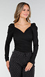 Deze zwarte top is gemaakt van een soepele stretchstof. Het model heeft een V-hals met overslag en lange mouwen met rimpelplooien op de schouders. Aan beide zijkanten zorgt een geplooid detail voor een aangesloten pasvorm. De stof is rekbaar en sluit mooi aan langs het lichaam.