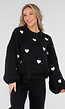 Deze zwarte trui is uitgevoerd in een grofgebreid patroon met een ronde halslijn. De lange ballonmouwen en de rechtvallende pasvorm geven de trui een los silhouet. Over de voorkant zijn meerdere witte hartapplicaties geplaatst, die contrasteren. De manchetten en onderzijde zijn afgewerkt met ribgebreide boorden.