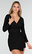Deze zwarte top is gemaakt van een zachte, rekbare stof met een wikkelontwerp aan de voorkant. De V-hals is diep uitgesneden en de lange mouwen sluiten nauw aan. De stof heeft een licht geribbelde structuur die soepel valt. Combineer met de bijpassende skort voor een complete set.