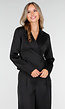 Deze zwarte blazer is gemaakt van een gladde satijnlook stof met lichte glans. Het model heeft een overslag aan de voorkant en wordt gesloten met een striksluiting op de zijkant. De blazer heeft een klassieke reverskraag, lange mouwen en een licht getailleerde pasvorm.